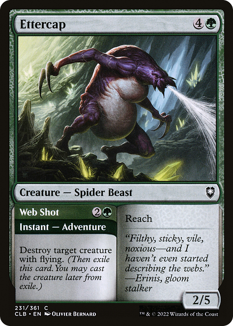 All of the above creatures feature green in some way, and hate on fliers in particular, as decks reliant on reach creatures are wont to do. Deadly Recluse is a classic two-drop, pairing reach with Deathtouch, another potent keyword we’ll cover soon. Silklash Spider is an Onslaught card originally (pre-keywording), that for five mana pairs reach with an activated ability to wipe the board of fliers. Ettercap is a more recent entry, giving a five-mana reach spider extra utility by being attached to an instant Destroy spell for fliers. Broodspinner combines reach and surveil, two defensively minded mechanics, with a sacrifice effect that creates a large number of fliers later in the game. And finally, Twin-Silk Spider gives you two 1/2 spiders with reach for 3 mana.